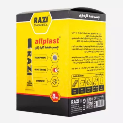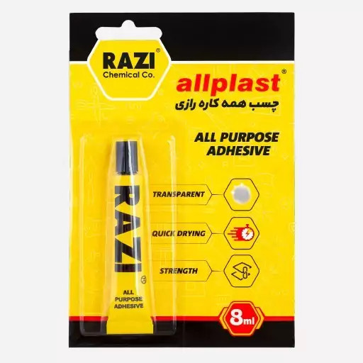دیدن محصولات مرتبطچسب تیوبی 8 سی سی همه كاره رازی در مصارف عمومی و خانگی جهت چسباندن انواع مواد از جنس لاستیك، پلاستیك، چرم، كاغذ، پارچه، سرامیك، شیشه، فوم، چوب و اسفنج به كاربرده می شود.این نوع چسب رازی استحکام خوبی دارد و کاربرد وسیعی در مصارف خانگی وصنعتی دارد. از موارد کاربرد آن میتوان به موارد زیر اشاره کرد: چسباندن کاغذ-شیشه-چینی چسباندن پلاستیک-نمد-سرامیک چسباندن لاستیک-چوب پنبه-پارچه چسباندن چرم ومقوا استفاده در دفترکار-صنایع دستی-مدل سازی ماکت سازی